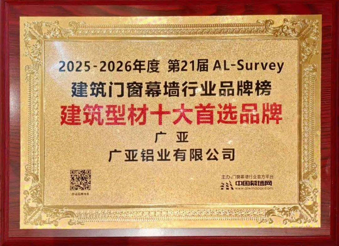 Recently, the results of the 21st AL-Survey for the 2025–2026 period—featuring the "Preferred Brand Rankings" and "Most Admired Projects of the Year" in the door, window, and curtain wall industry—were officially unveiled. Leveraging its exceptional comprehensive strength and market reputation, Guangya Aluminum was once again honored with the title of "Top 10 Preferred Brands for Architectural Profiles." Furthermore, the company successfully secured a spot in the "Top 10 Preferred Innovative Materials" database for the real estate and door/window/curtain wall industry supply chain.